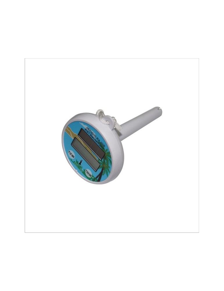 Funciona con energía solar. Marca en la pantalla digital la temperatura del agua. Fabricado en ABS.