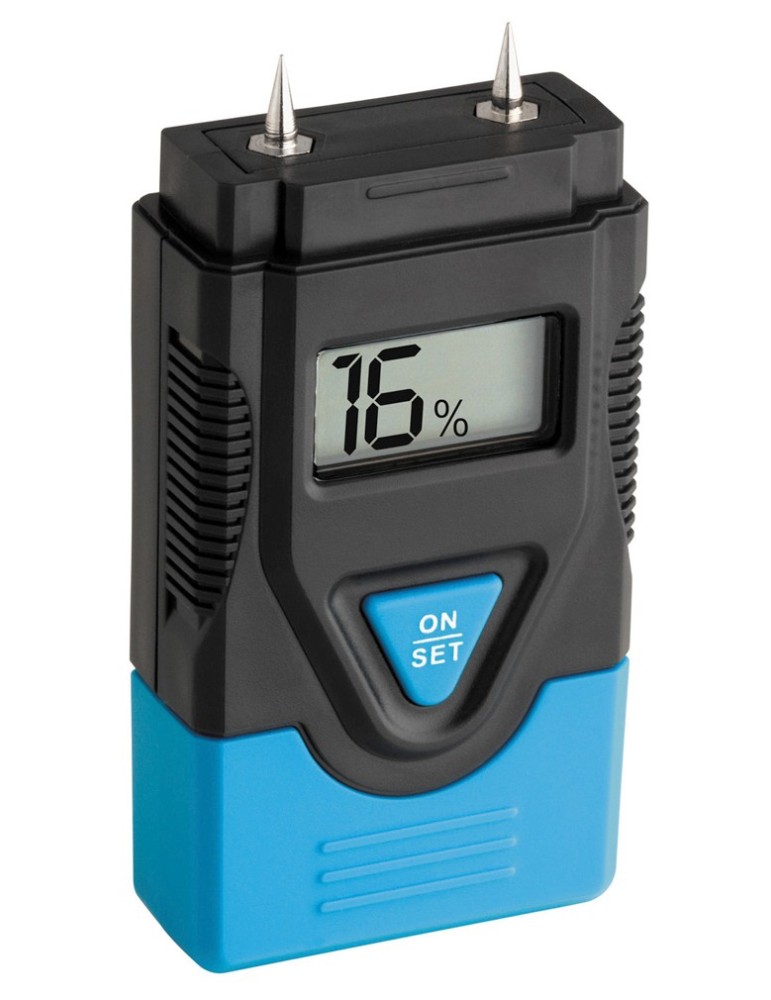 Higrómetro digital de bolsillo para mediciones de contenido de humedad en yeso y madera. Longitud de electrodo: 8 mm. Rango de temperatura: 0-40ºC. Alimentación: 4 pilas LR44. Tamaño: 80 x 4 x 20 mm, Peso: 50 g.