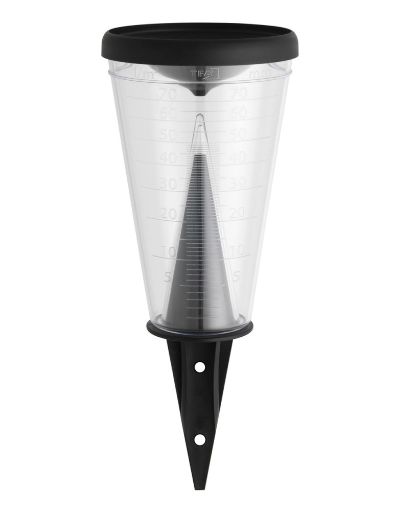 Pluviómetro plástico 70 litros. Con tapa extraíble para evitar la evaporación y con soporte para mástil o para clavar.