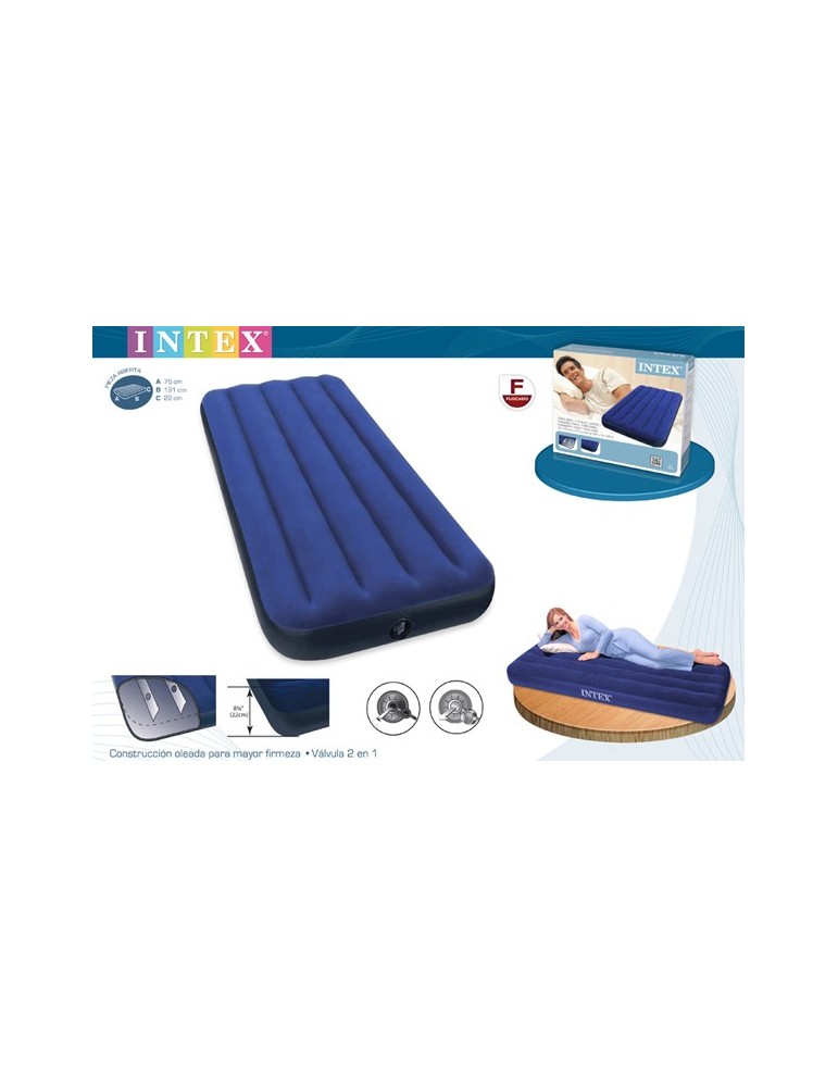 Colchón hinchable fabricado con vinilo, con superficie flocada resistente al agua. Con válvula 2-1 para un rápido inflado-desinflado. Se pliega de forma compacta para un fácil transporte. 191 x 76 x 22 cm.