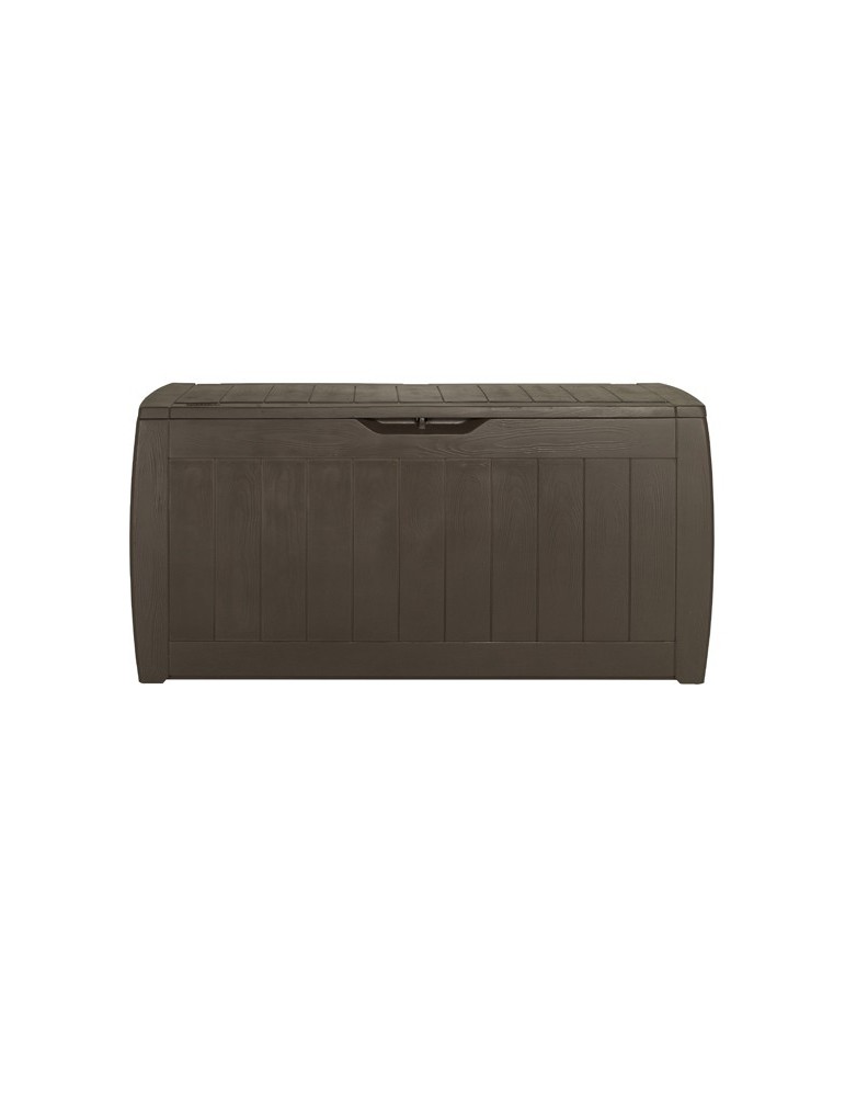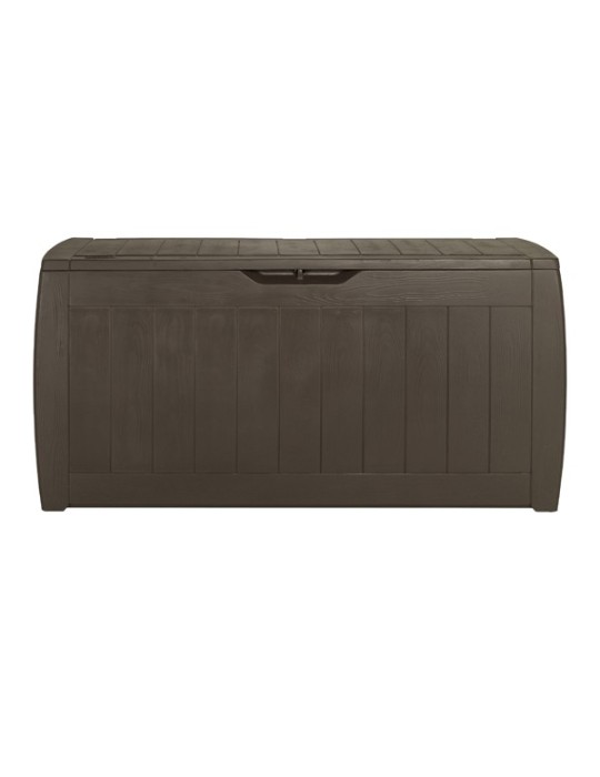 Exterior, imitación madera, 100 % polipropileno reciclable, fácil montaje mediante sistema click. Capacidad: 270 litros. 117 x 45 x 57 cm.