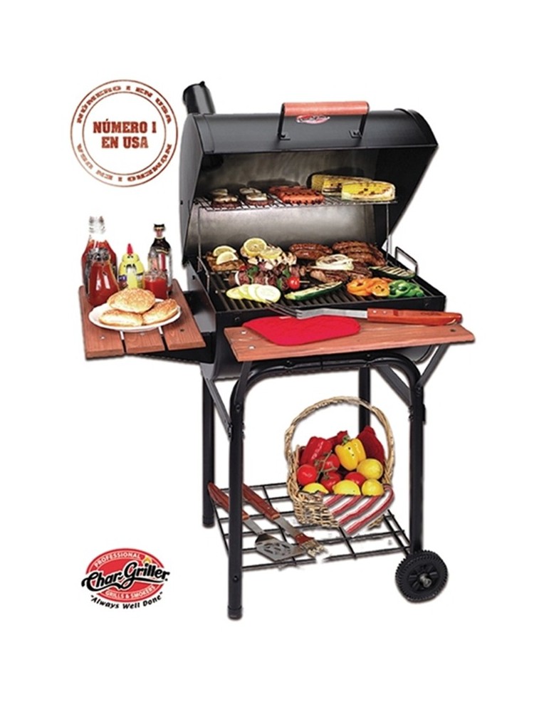 Carro de acero tubular. Parrilla ajustable 3 alturas (51 x 50 cm.), 0,28 m2 antiadherente. Fácil limpieza. Rejilla para mantener la comida caliente. Chimenea. Termómetro. Fácil montaje. Medida 88,9 x 73,7 x 127 cm. Peso 22,6 kg.