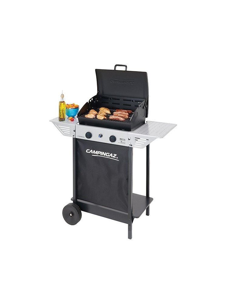 Potencia: 7.100 W. Superficie de cocina: 1.535 cm2. 2 Quemadores de acero aluminizado. Encendido Piezo. Parrilla Cromada. 2 Mesas laterales plegables con ganchos para colgar accesorios de cocina. Tapa de acero estampado. 2 ruedas. Pantalla frontal de tela.