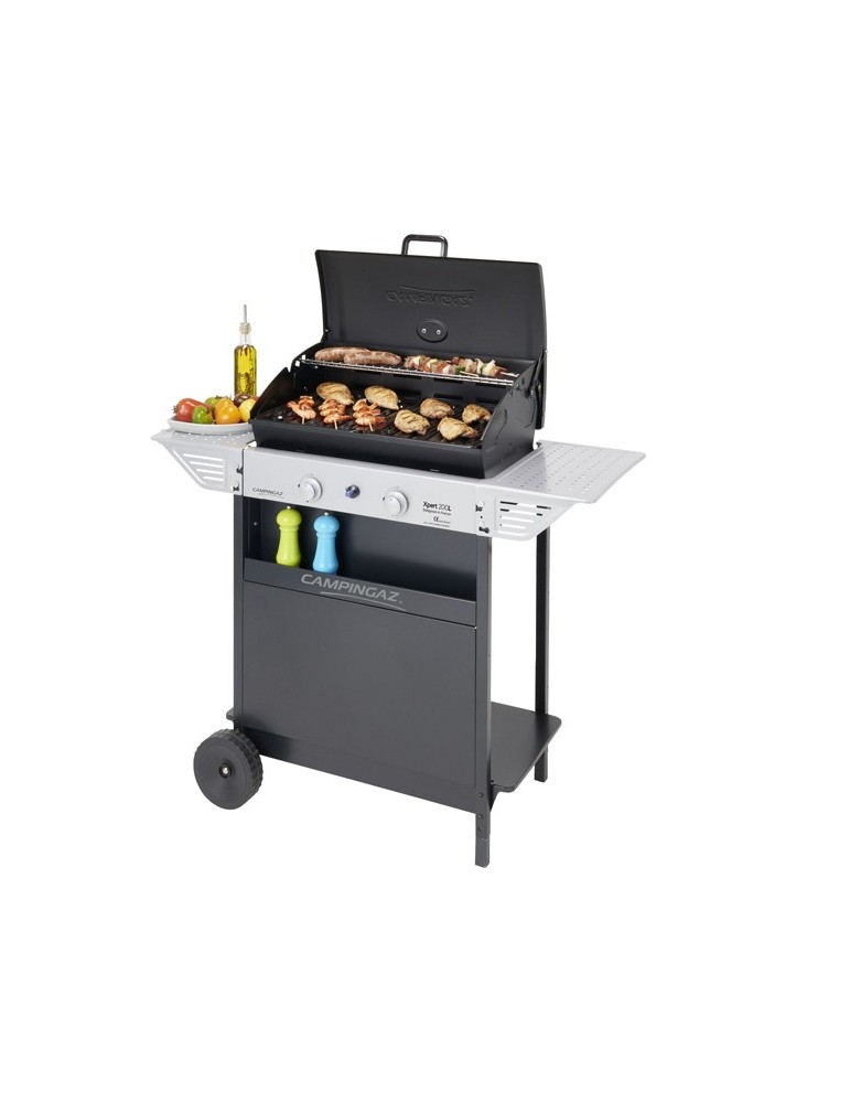 Potencia: 7.100 W. Superficie de cocina: 1.880 cm2. 2 quemadores de acero aluminizado. Encendido Piezo. Parrilla de acero esmaltado. 2 mesas laterales plegables. Tapa de acero estampado. Opción motor de asado. 2 ruedas. Pantalla frontal de acero con bandeja integrada. Plancha de regalo.
