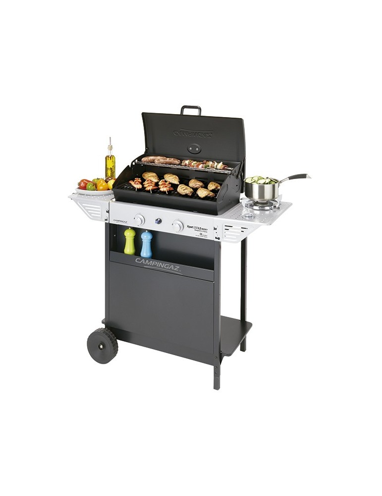 Potencia: 8.200 W. Hornillo lateral: 2.100 W. Superficie de cocina: 1.800 cm2. 2 quemadores de acero aluminizado. Encendido piezoeléctrico. Parrilla de hierro fundido. 1 mesa lateral plegable y otra con hornillo lateral. Con ruedas.