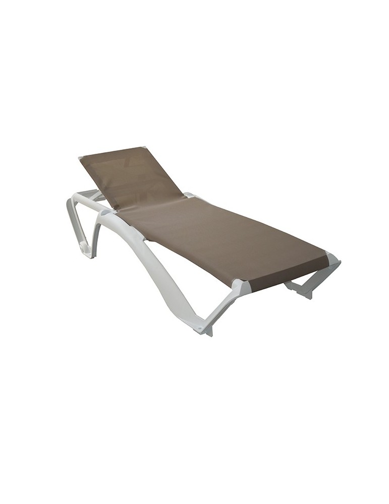 Estructura de polipropileno y fibra de vidrio. Textileno termosoldado para mayor resistencia. Protección UV. Ruedas en patas traseras y tacos antideslizantes en las delanteras. Incorpora posavasos. Reclinable en 4 posiciones. Color azul o marrón.