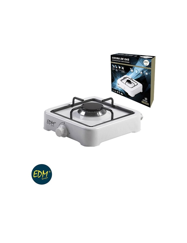 Esmaltada. 1 fuego Ø75 mm. Para utilizar con gas butano y solo en exteriores. Dimensiones: 33 x 33 x 8 cm.