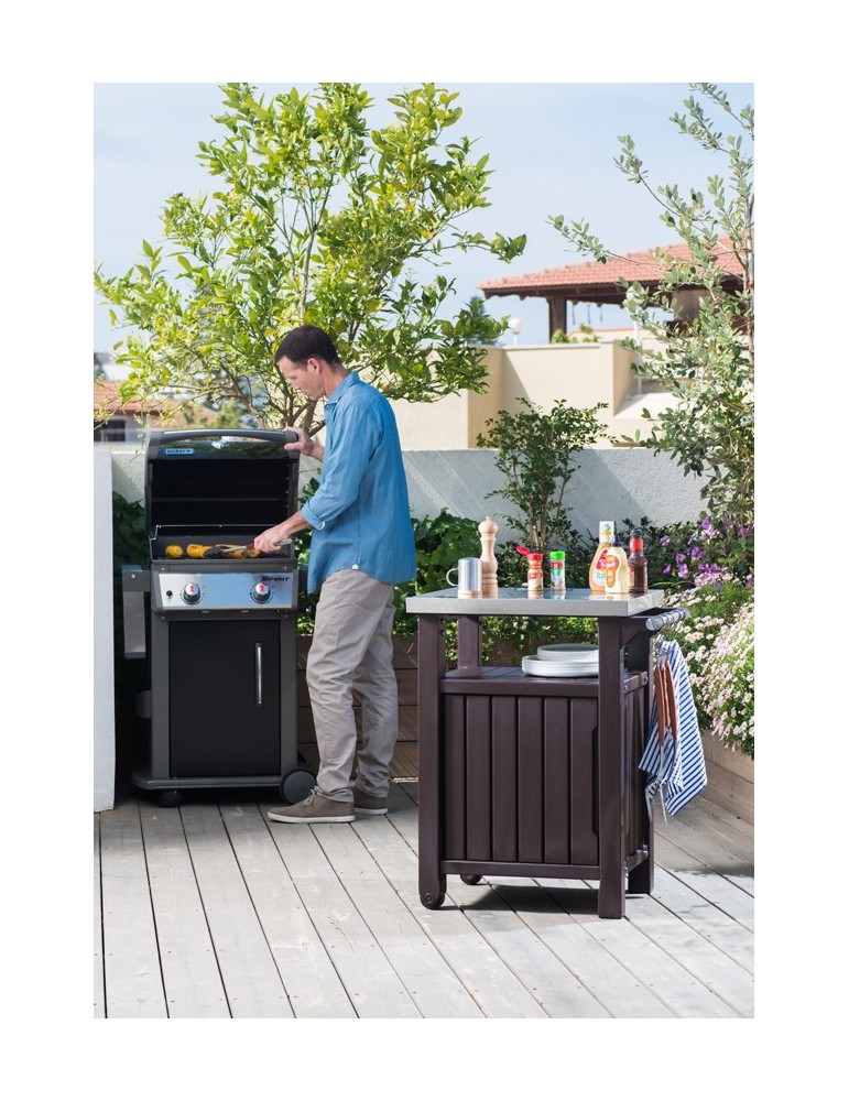 Parte superior de gran dureza para poder cocinar y trabajar con seguridad. Capacidad en total 150 l. Incluye dos ruedas para fácil transporte. Fabricado en PVC de gran resistencia, preparado para todos los climas. 82 x 51,7 x 90 cm.