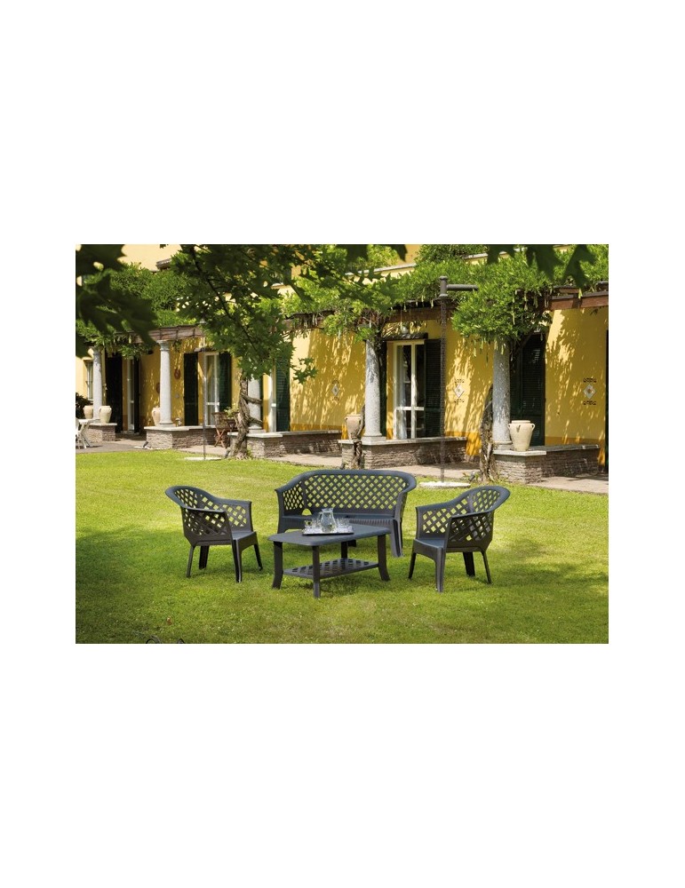 PROGARDEN 2 butacas, 1 sofá y una mesita baja rectangular en polipropileno de color antracita. Acabado satinado. Mesa 90 x 60 x 46 cm. Butaca 72 x 72 x 76 cm. Sofá 134 x 72 x 76 cm.