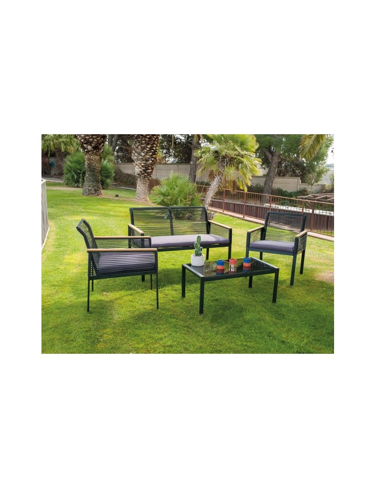 Conjunto en acero negro y mimbre de plástico. Incluye cojines en gris. 2 sillones: 60 x 75 x 77 cm, sofá: 116,5 x 75 x 77 cm y mesa: 83,5 x 45 x 37 cm.