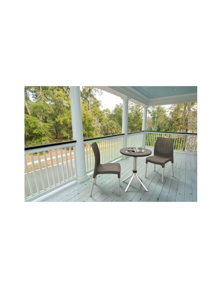 Imitación rattan y patas metálicas. Especial para espacios reducidos. Mesa de 60 cm de diámetro y altura 75 cm. 2 sillas de 48 x 57 x 87 cm.