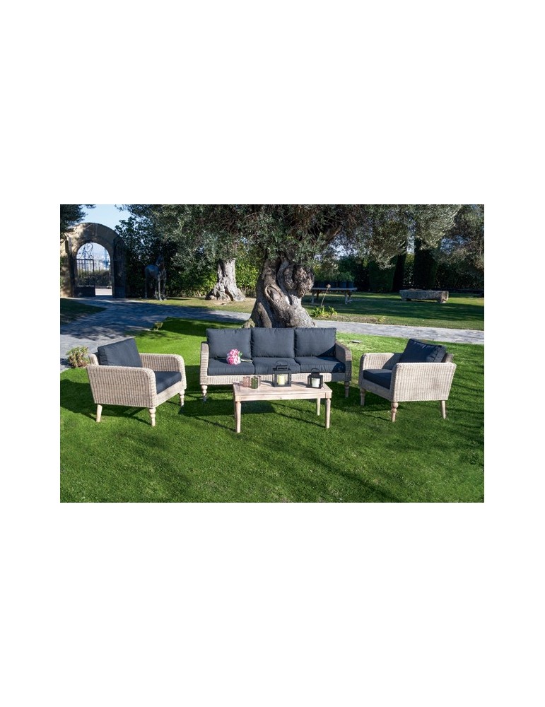 Fabricado en aluminio, madera de acacia y ratán. Asiento levemente reclinado que mejora la comodidad. Cojines de 10 cm de espesor. Mesa: 100 x 50 x 42 cm. 2 sillones: 77 x 80 x 75 cm. 1 sofá: 194 x 80 x 75 cm.
