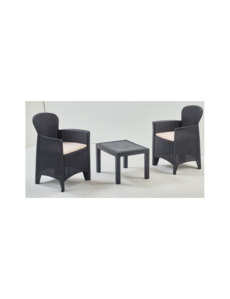 Diseño de ratán en color antracita. Incluye cojines. Silla: 59 x 57 x 85,5 cm y mesa: 59 x 46 x 40 cm.