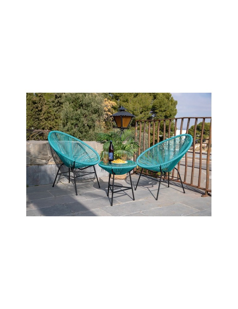 Mesa con cristal de 5 cm de grosor, 46 cm de diámetro y 45 cm de altura. 2 sillones de 70 x 80 x 85 cm. Colores turquesa o negro.