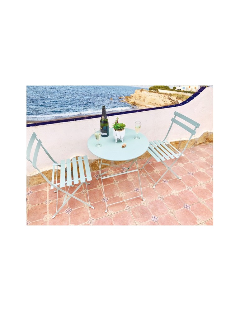 Color menta. Mesa: 60 cm diám. 71 cm alto. Sillas: 41 x 36 x 79 cm.