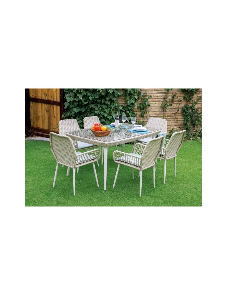Conjunto en color crudo con cojines. Mesa con cristal 160 x 94 x 74 cm. 6 sillas: 57 x 63 x 84 cm.