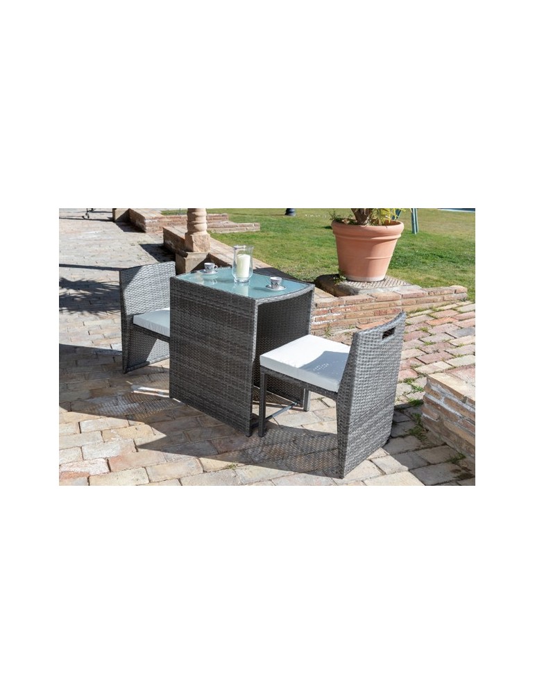 Conjunto en acero y ratán. Cojines en color beige. Se recoge debajo de la mesa. Mesa: 75 x 52 x 75 cm. Silla: 45 x 55 x 70 cm.