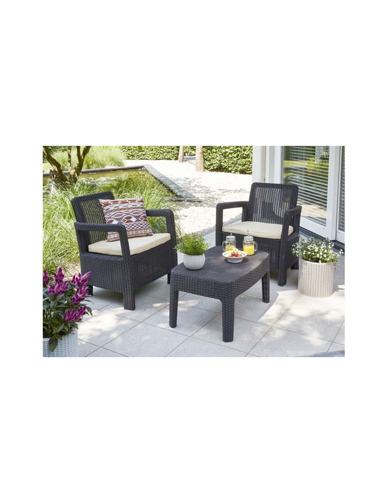 Diseño de ratán redondo abierto de 4,5 mm. Incluye cojín en asiento y respaldo ergonómico para un máximo confort. Color arena. Sillón: 71 x 69 x 79 cm (2 uds.). Mesa: 77 x 55 x 40 cm.