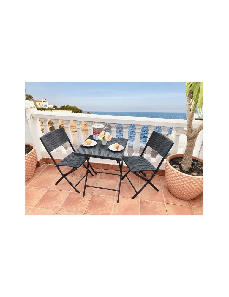 Acero y plástico. Mesa: 58 x 58 x 71,5 cm y sillas: 45 x 46 x 80/45cm.