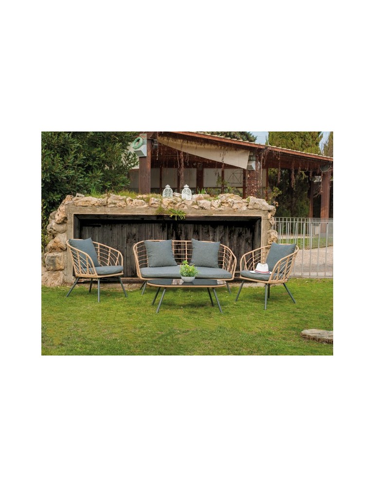 Conjunto en ratán y acero beige. Incluyen cojines en gris oscuro. 2 sillones: 65 x 70,5 x 73,5 cm, sofá: 139 x 68 x 73,5 cm y mesa: 90 x 50 x 34 cm.