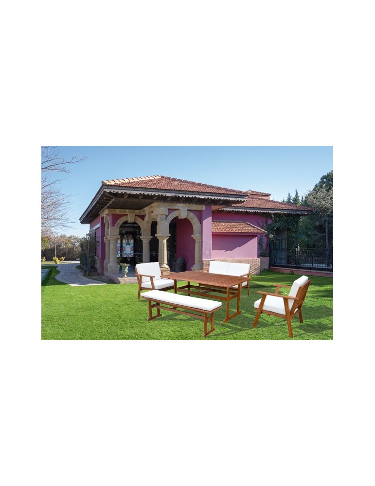 Mesa: 145 x 90 x 68,5 cm. 2 sillones: 66 x 72 x 76 cm. 1 sofá: 66 x 121 x 76 cm. 1 banco: 135 x 32 x 42 cm. Cojines de 10 cm de espesor.