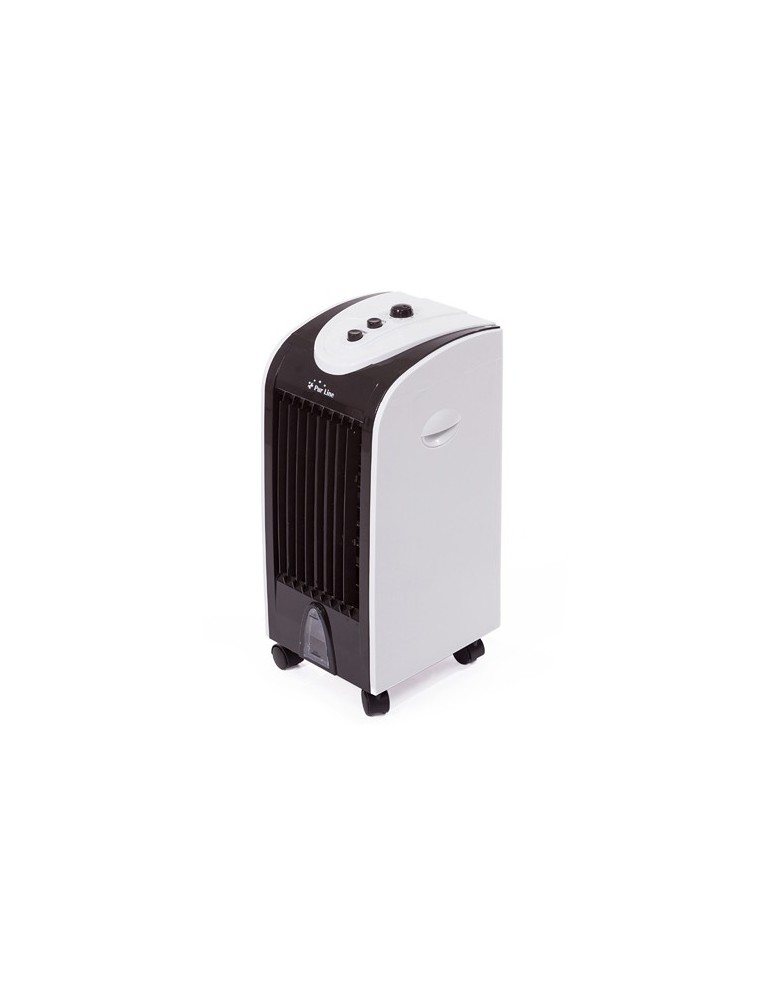 Climatización por humidificación. Consumo: 75 W. Caudal: 400 m³/h. Capacidad depósito: 4 Litros (se puede echar hielo en el depósito). 3 Velocidades. Nivel 56 dB. Medidas 25 x 29 x 58 cm. Peso: 5,3 kg.