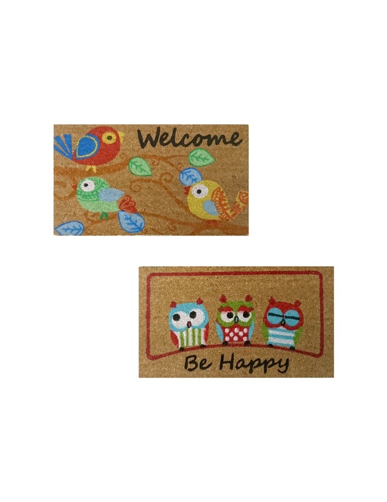Divertido felpudo en fibra de coco natural con base antideslizante de PVC. Excelente limpieza y absorción de agua. Diseños surtidos. 40 x 70 cm.