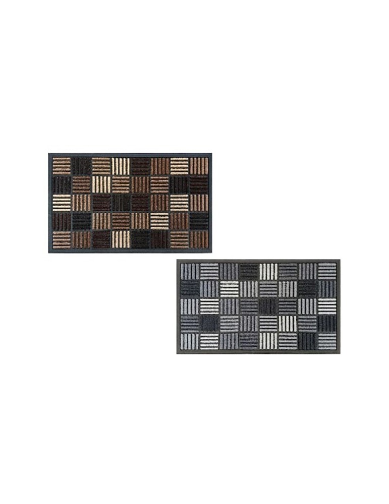 Elegante y decorativo felpudo en moqueta de Nylon moldeado y con relieve. Alto: 6 mm. Base y borde e incrustaciones de goma con base antideslizante. Diseños surtidos. 45 x 75 cm.